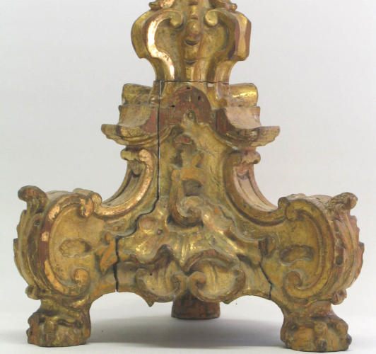 : geöffnete Fugen, große Fehlstelle im Holzträger (o. Mitte), Fassungsausbrüche.